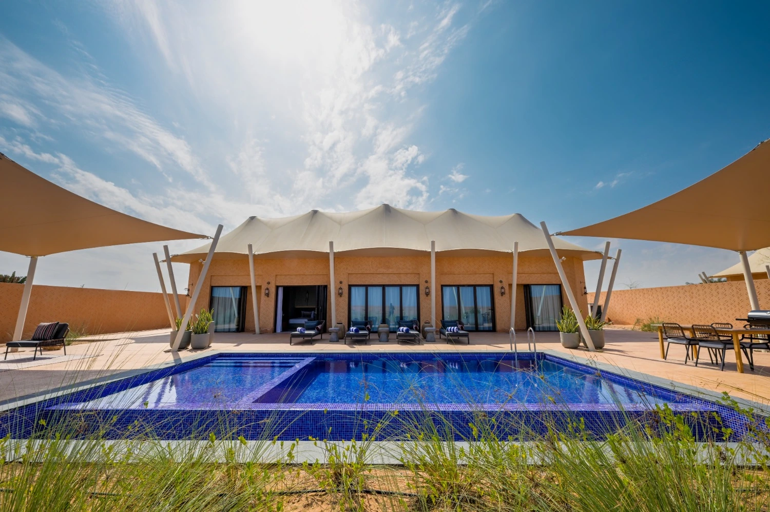 The Private one-bedroom tent overlooks the desert dunes with spacious outdoor sitting, temp-controlled pool and sunbeds.
